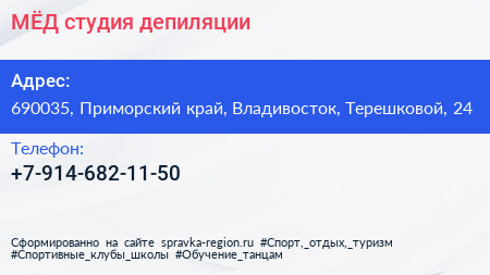 МЁД, студия депиляции по адресу 690035, Приморский край, Владивосток, Терешковой, 24 в дальнейшем Организация, размещена в следующих категориях: