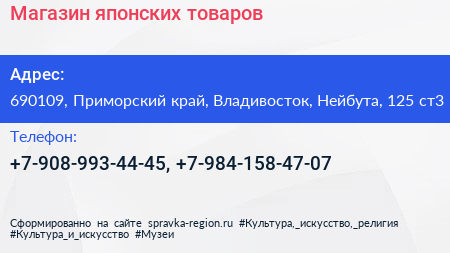Магазин японских товаров по адресу 690109, Приморский край, Владивосток, Нейбута, 125 ст3 в дальнейшем Организация, размещена в следующих категориях: