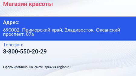 Магазин красоты по адресу 690002, Приморский край, Владивосток, Океанский проспект, 87а в дальнейшем Организация, размещена в следующих категориях: