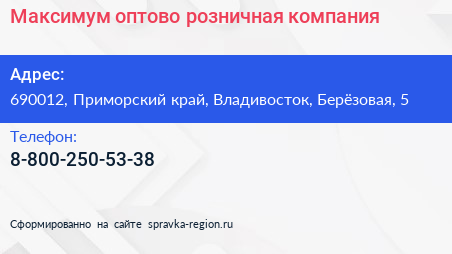 Максимум, оптово-розничная компания по адресу 690012, Приморский край, Владивосток, Берёзовая, 5 в дальнейшем Организация, размещена в следующих категориях: