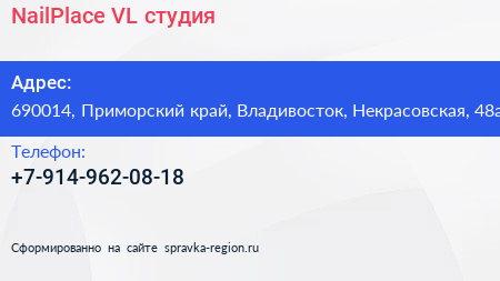NailPlace.VL, студия по адресу 690014, Приморский край, Владивосток, Некрасовская, 48а в дальнейшем Организация, размещена в следующих категориях:
