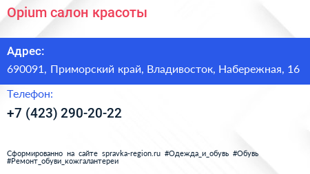Opium, салон красоты по адресу 690091, Приморский край, Владивосток, Набережная, 16 в дальнейшем Организация, размещена в следующих категориях: