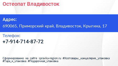 Остеопат Владивосток по адресу 690065, Приморский край, Владивосток, Крыгина, 17 в дальнейшем Организация, размещена в следующих категориях: