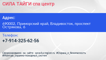 СИЛА ТАЙГИ, спа-центр по адресу 690002, Приморский край, Владивосток, проспект Острякова, 6 в дальнейшем Организация, размещена в следующих категориях: