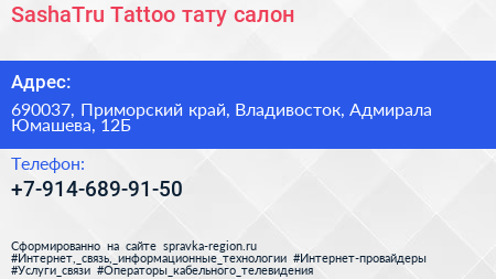 SashaTru Tattoo, тату-салон по адресу 690037, Приморский край, Владивосток, Адмирала Юмашева, 12Б в дальнейшем Организация, размещена в следующих категориях: