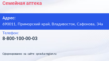 Семейная аптека по адресу 690011, Приморский край, Владивосток, Сафонова, 34а в дальнейшем Организация, размещена в следующих категориях: