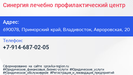 Синергия, лечебно-профилактический центр по адресу 690078, Приморский край, Владивосток, Авроровская, 20 в дальнейшем Организация, размещена в следующих категориях: