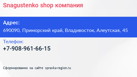 Snagustenko shop, компания по адресу 690090, Приморский край, Владивосток, Алеутская, 45 в дальнейшем Организация, размещена в следующих категориях: