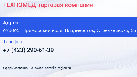 ТЕХНОМЕД, торговая компания по адресу 690065, Приморский край, Владивосток, Стрельникова, 3а в дальнейшем Организация, размещена в следующих категориях: