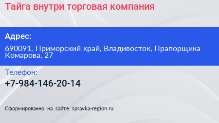 Тайга внутри, торговая компания по адресу 690091, Приморский край, Владивосток, Прапорщика Комарова, 27 в дальнейшем Организация, размещена в следующих категориях: