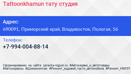 Tattoonkhamun, тату-студия по адресу 690091, Приморский край, Владивосток, Пологая, 56 в дальнейшем Организация, размещена в следующих категориях: