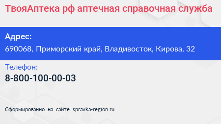 ТвояАптека.рф, аптечная справочная служба по адресу 690068, Приморский край, Владивосток, Кирова, 32 в дальнейшем Организация, размещена в следующих категориях: