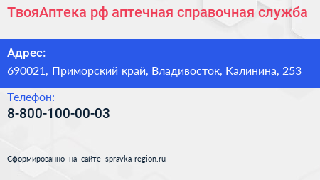 ТвояАптека.рф, аптечная справочная служба по адресу 690021, Приморский край, Владивосток, Калинина, 253 в дальнейшем Организация, размещена в следующих категориях: