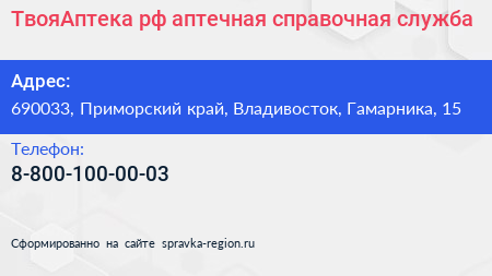 ТвояАптека.рф, аптечная справочная служба по адресу 690033, Приморский край, Владивосток, Гамарника, 15 в дальнейшем Организация, размещена в следующих категориях: