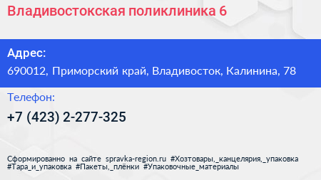 Владивостокская поликлиника №6 по адресу 690012, Приморский край, Владивосток, Калинина, 78 в дальнейшем Организация, размещена в следующих категориях: