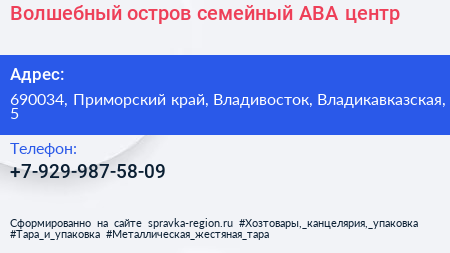 Волшебный остров, семейный ABA центр по адресу 690034, Приморский край, Владивосток, Владикавказская, 5 в дальнейшем Организация, размещена в следующих категориях: