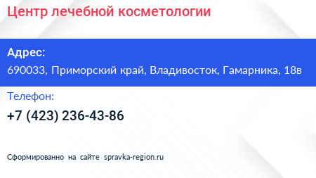 Центр лечебной косметологии по адресу 690033, Приморский край, Владивосток, Гамарника, 18в в дальнейшем Организация, размещена в следующих категориях: