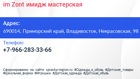 im Zont, имидж-мастерская по адресу 690014, Приморский край, Владивосток, Некрасовская, 98 в дальнейшем Организация, размещена в следующих категориях: