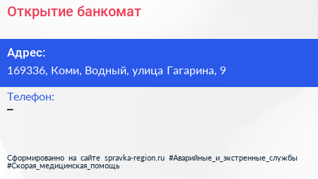 Открытие, банкомат по адресу 169336, Коми, Водный, улица Гагарина, 9 в дальнейшем Организация, размещена в следующих категориях: