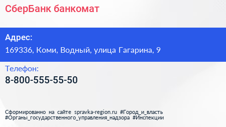 СберБанк, банкомат по адресу 169336, Коми, Водный, улица Гагарина, 9 в дальнейшем Организация, размещена в следующих категориях: