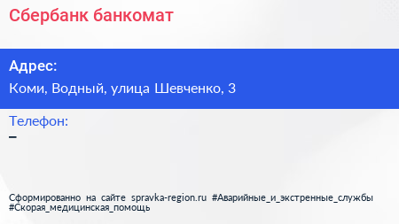 Сбербанк, банкомат по адресу Коми, Водный, улица Шевченко, 3 в дальнейшем Организация, размещена в следующих категориях: