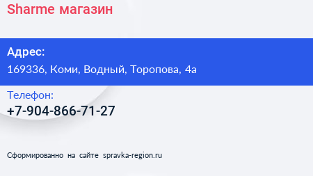 Sharme, магазин по адресу 169336, Коми, Водный, Торопова, 4а в дальнейшем Организация, размещена в следующих категориях: