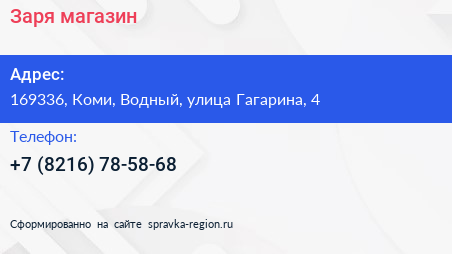 Заря, магазин по адресу 169336, Коми, Водный, улица Гагарина, 4 в дальнейшем Организация, размещена в следующих категориях: