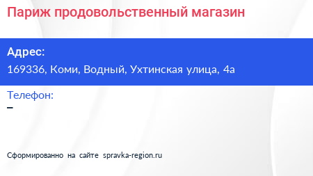 Париж, продовольственный магазин по адресу 169336, Коми, Водный, Ухтинская улица, 4а в дальнейшем Организация, размещена в следующих категориях: