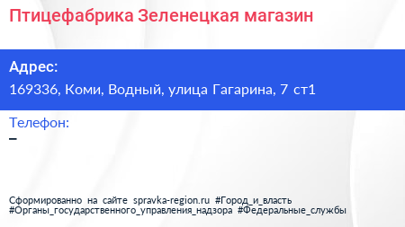 Птицефабрика Зеленецкая, магазин по адресу 169336, Коми, Водный, улица Гагарина, 7 ст1 в дальнейшем Организация, размещена в следующих категориях: