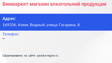 Винмаркет, магазин алкогольной продукции по адресу 169336, Коми, Водный, улица Гагарина, 8 в дальнейшем Организация, размещена в следующих категориях: