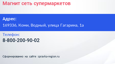 Магнит, сеть супермаркетов по адресу 169336, Коми, Водный, улица Гагарина, 1а в дальнейшем Организация, размещена в следующих категориях: