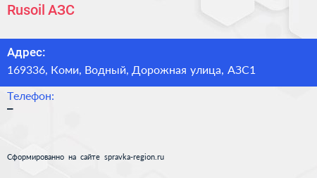 Rusoil, АЗС по адресу 169336, Коми, Водный, Дорожная улица, АЗС1 в дальнейшем Организация, размещена в следующих категориях: