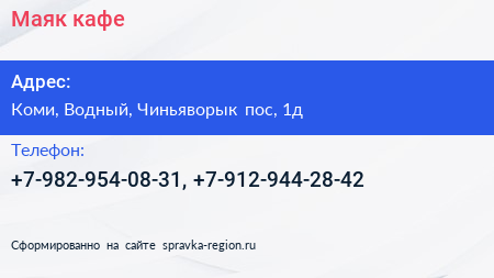 Маяк, кафе по адресу Коми, Водный, Чиньяворык пос, 1д в дальнейшем Организация, размещена в следующих категориях: