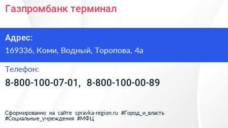 Газпромбанк, терминал по адресу 169336, Коми, Водный, Торопова, 4а в дальнейшем Организация, размещена в следующих категориях: