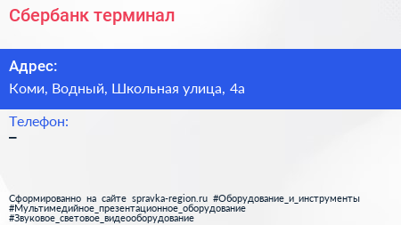 Сбербанк, терминал по адресу Коми, Водный, Школьная улица, 4а в дальнейшем Организация, размещена в следующих категориях: