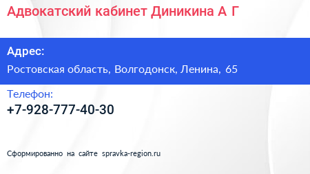 Адвокатский кабинет Диникина А.Г. по адресу Ростовская область, Волгодонск, Ленина, 65 в дальнейшем Организация, размещена в следующих категориях: