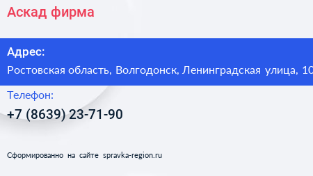 Аскад, фирма по адресу Ростовская область, Волгодонск, Ленинградская улица, 10 в дальнейшем Организация, размещена в следующих категориях: