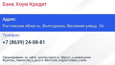 Банк Хоум Кредит по адресу Ростовская область, Волгодонск, Весенняя улица, 56 в дальнейшем Организация, размещена в следующих категориях: