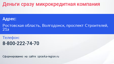 Деньги сразу, микрокредитная компания по адресу Ростовская область, Волгодонск, проспект Строителей, 21а в дальнейшем Организация, размещена в следующих категориях: