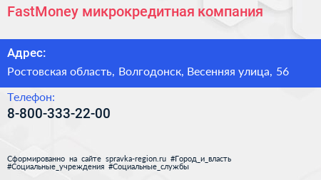 FastMoney, микрокредитная компания по адресу Ростовская область, Волгодонск, Весенняя улица, 56 в дальнейшем Организация, размещена в следующих категориях:
