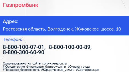 Газпромбанк по адресу Ростовская область, Волгодонск, Жуковское шоссе, 10 в дальнейшем Организация, размещена в следующих категориях: