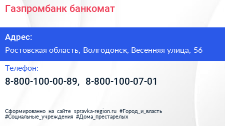 Газпромбанк, банкомат по адресу Ростовская область, Волгодонск, Весенняя улица, 56 в дальнейшем Организация, размещена в следующих категориях: