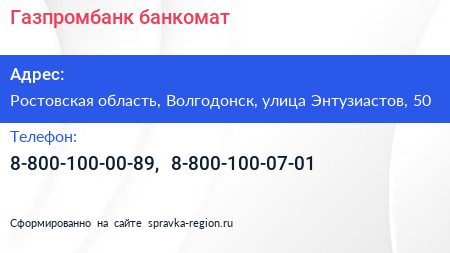Газпромбанк, банкомат по адресу Ростовская область, Волгодонск, улица Энтузиастов, 50 в дальнейшем Организация, размещена в следующих категориях: