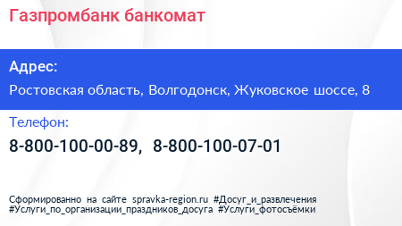 Газпромбанк, банкомат по адресу Ростовская область, Волгодонск, Жуковское шоссе, 8 в дальнейшем Организация, размещена в следующих категориях: