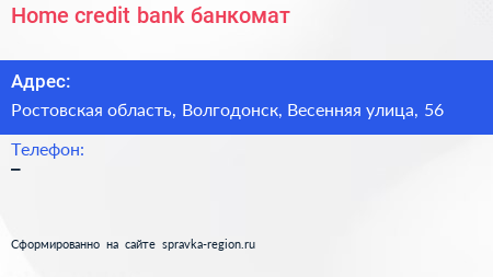 Home credit bank, банкомат по адресу Ростовская область, Волгодонск, Весенняя улица, 56 в дальнейшем Организация, размещена в следующих категориях: