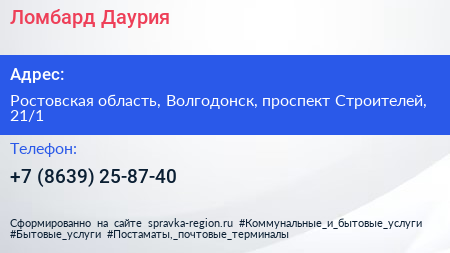 Ломбард Даурия по адресу Ростовская область, Волгодонск, проспект Строителей, 21/1 в дальнейшем Организация, размещена в следующих категориях: