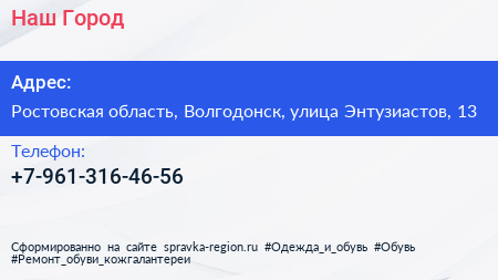 Наш Город по адресу Ростовская область, Волгодонск, улица Энтузиастов, 13 в дальнейшем Организация, размещена в следующих категориях: