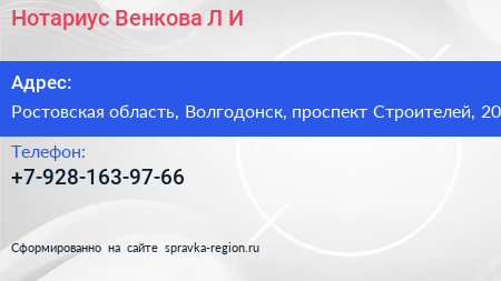 Нотариус Венкова Л.И. по адресу Ростовская область, Волгодонск, проспект Строителей, 20 в дальнейшем Организация, размещена в следующих категориях:
