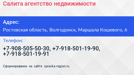 Салита, агентство недвижимости по адресу Ростовская область, Волгодонск, Маршала Кошевого, 6 в дальнейшем Организация, размещена в следующих категориях: