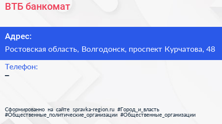 ВТБ, банкомат по адресу Ростовская область, Волгодонск, проспект Курчатова, 48 в дальнейшем Организация, размещена в следующих категориях: